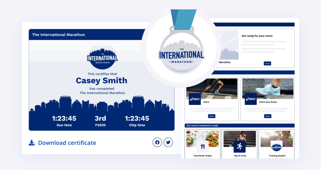- Offer digital medals – You can either skip physical medals altogether or perhaps allow participants to opt out and choose a digital medal instead. Similar to digital finisher certificates, digital medals can easily be shared on social media.