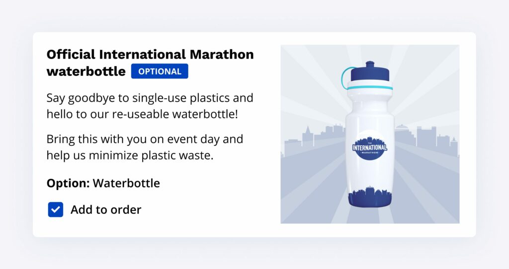 - Offer additional eco-friendly options during registration – Alternatively, you could simply add eco-friendly options to your registration form that participants can add to their order in addition to your other event products.