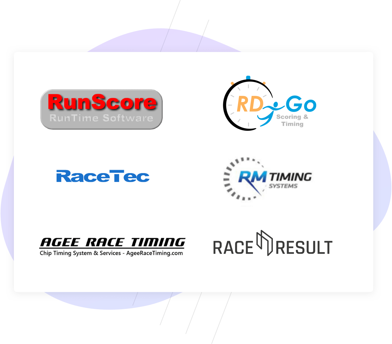 The timing team at Race Roster works on software integrations to ease the manual work that has historically bogged down timers. We integrate with many providers, including, but not limited to RunScore, Race Director, RM Timing, RaceTec, Race Result, and Agee Race Timing. Learn more
