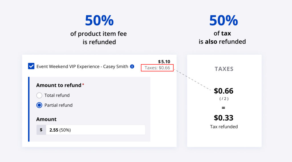 For example, if the participant was charged $5.10 for a product and a tax fee of $0.66, and you issued a 50% refund, the participant would be refunded $2.55 of the product and $0.33 of the additional tax.