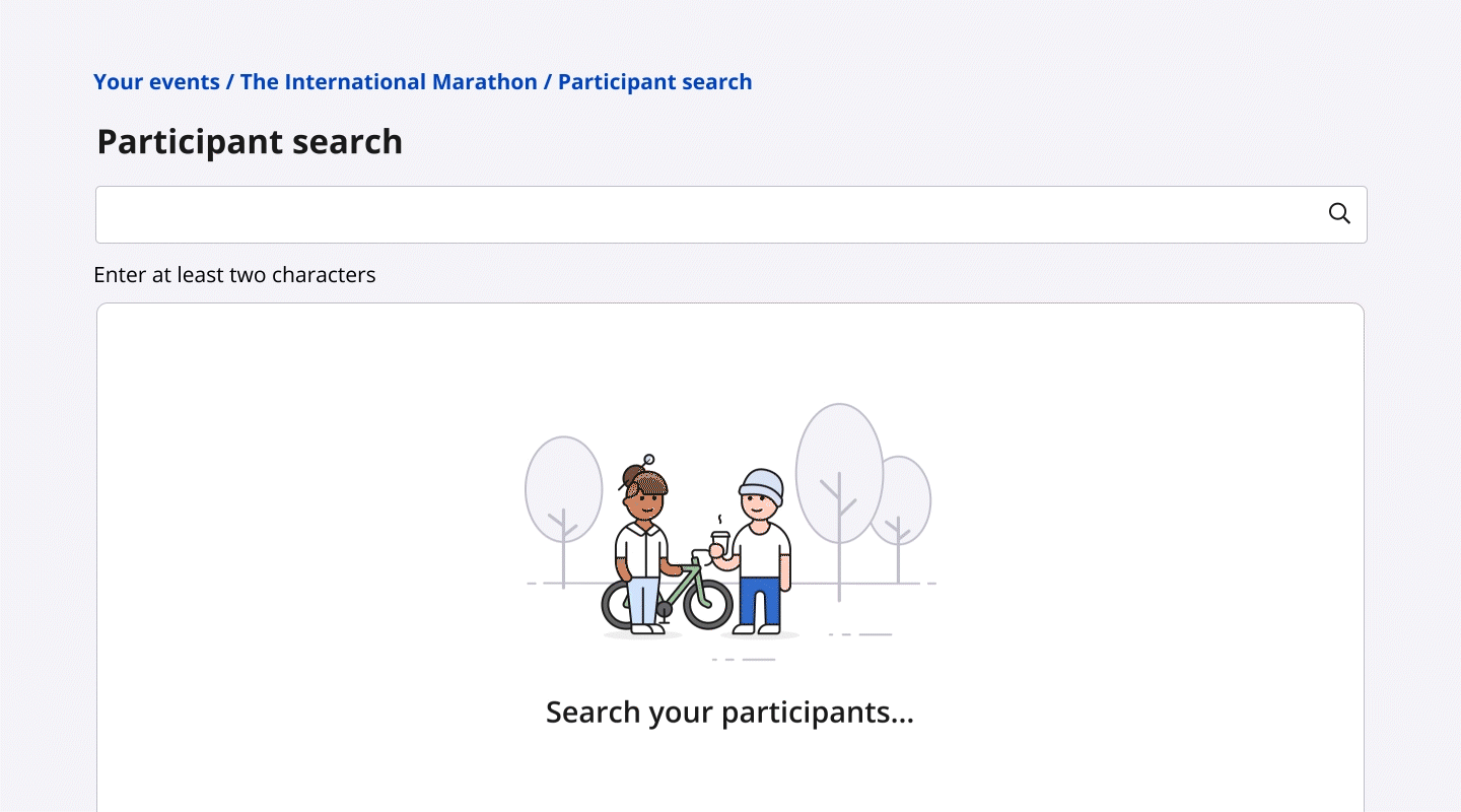 Participant search gives your administrative or customer service team the ability to look up individual event participants without having to work through the entire participant list.