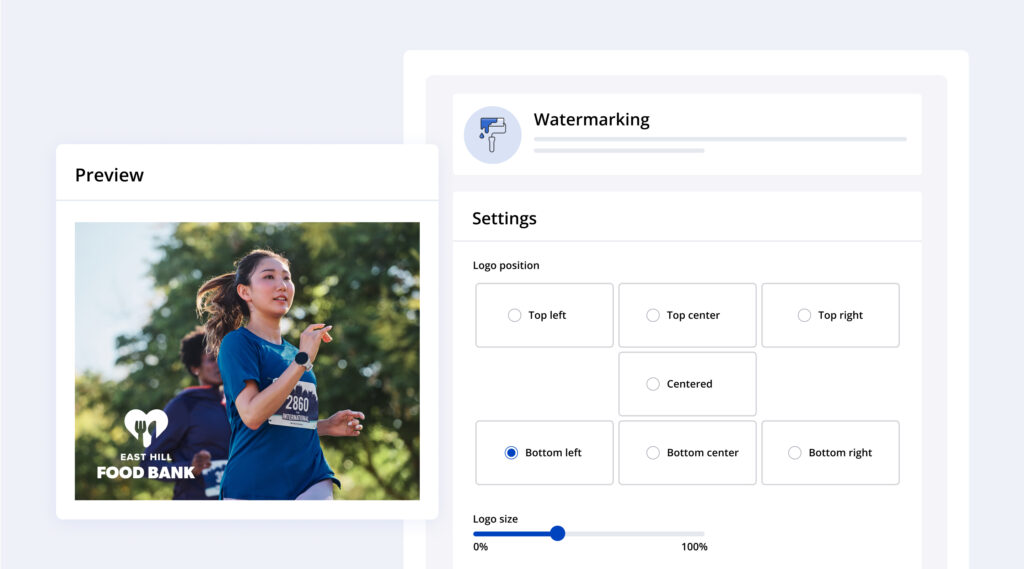 Highlight sponsors or fundraising organizations — Photos are an effective way to bring attention to your event partners thanks to our watermarking tool. This easy-to-use feature allows you to upload your partners’ logos onto gallery images so that your event partners benefit when participants share photos.