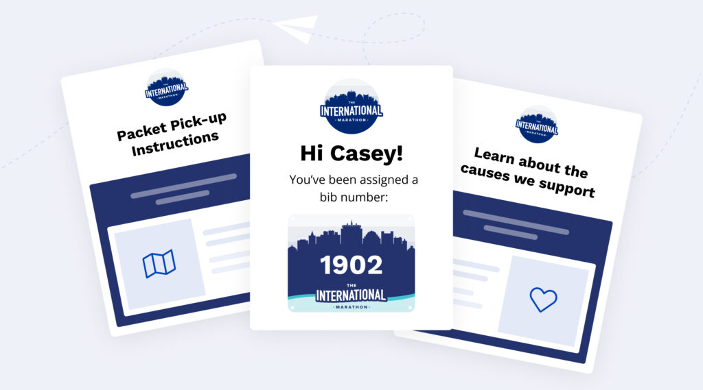 Share important event information — Provide a smooth experience by keeping participants up to date on everything they need to know. Send emails that explain your check-in and packet pick-up process, supply participants with event and course maps along with a detailed timeline, or call attention to sponsors and fundraising partners.