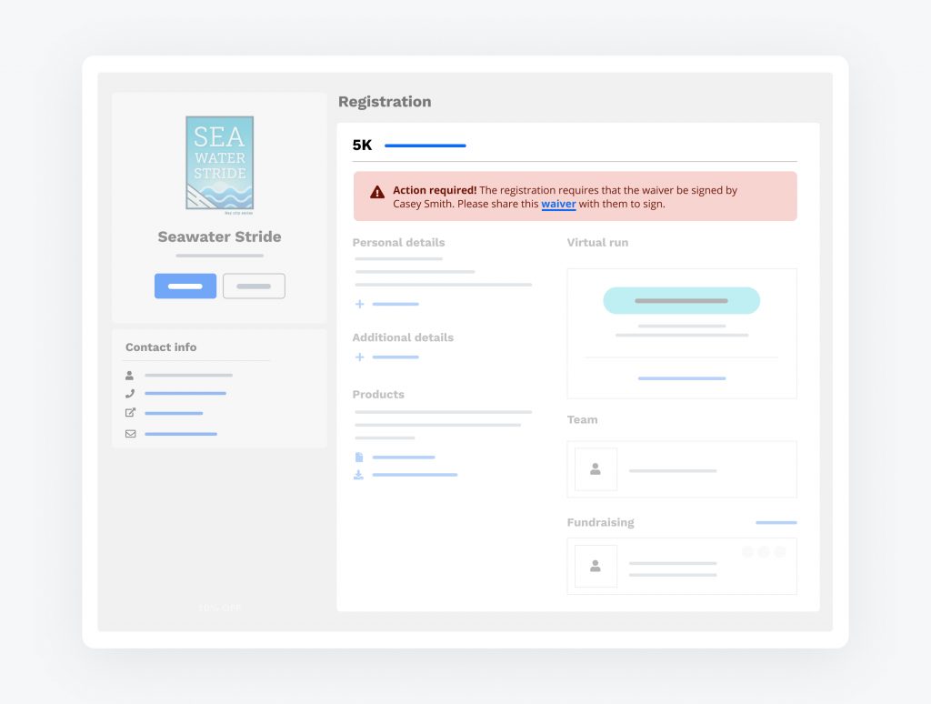 A call-to-action to sign their waiver will also appear prominently on their participant dashboard, making it easy for your participants to determine where to go to sign the required waiver.