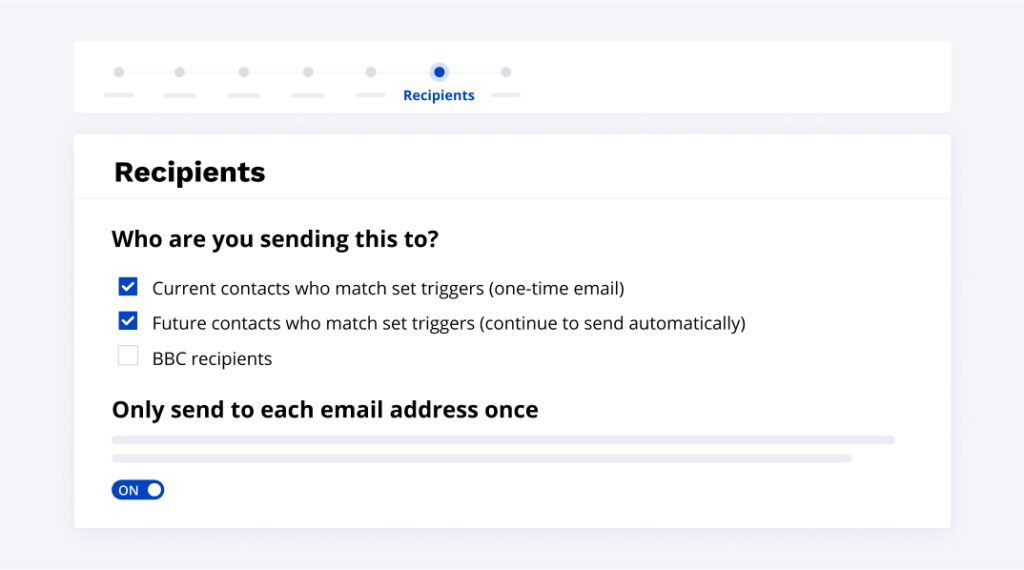 For example, you may have a campaign that you want to send to everyone who is currently registered for your event, but you also want to make sure that people who haven’t registered yet get the email once they are registered. In this case, you would select both “Current contacts who match set triggers (one-time email)” and “Future contacts who match set triggers (continue to send automatically)”.